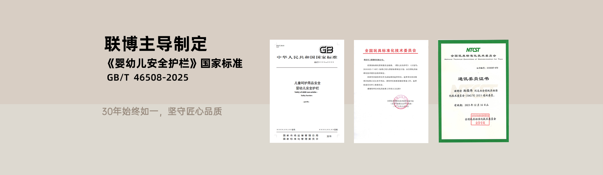 近日,国家市场监督管理总局、国家标准化管理委员会发布中华人民共和国国家标准公告(2025 年第24号),由浙江联博新材料有限公司(曾用名:瑞安市三联塑料有限公司)作为主要起草单位、公司产品经理池俊伟担任起草人的国家标准《儿童呵护用品安全 婴幼儿安全护栏》(GB/T 46508-2025)正式获批发布,并将于 2026 年 11 月 1 日起全面实施。这一标准的出台,不仅填补了当前婴幼儿围栏类目缺乏统